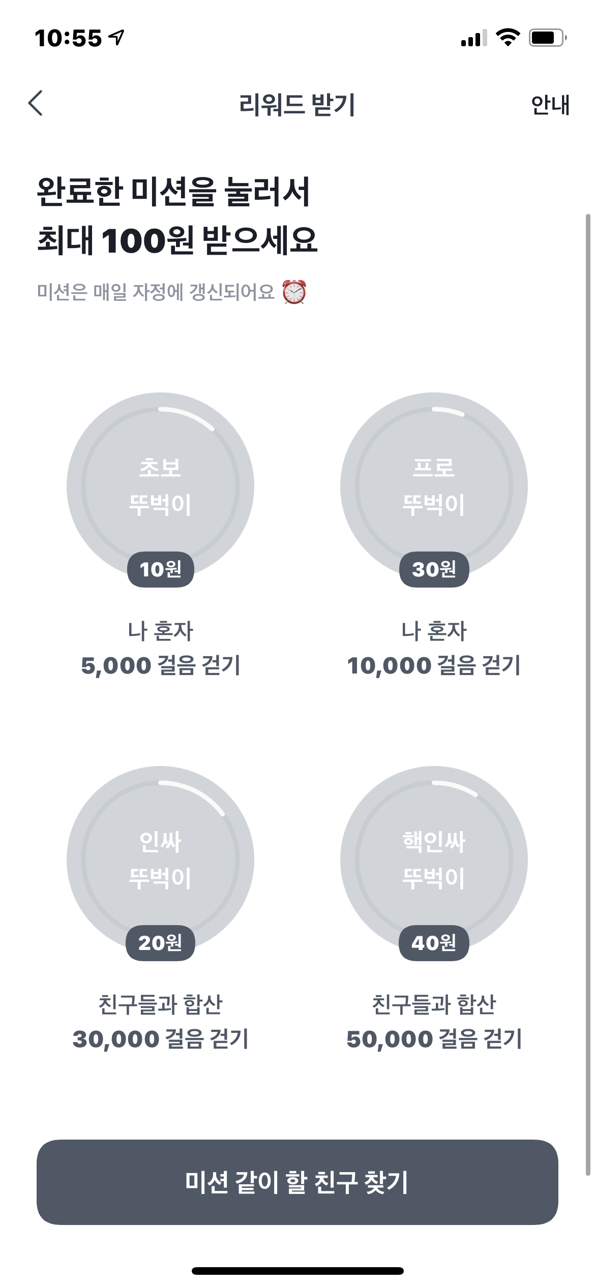 아래 사진처럼 혼자 1만 보 채우시면 30원 친구들과 같이하면 하루 최대 100원을 받을 수 있어요.
